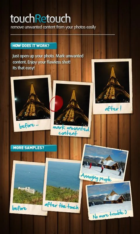 Antes de mostrar las fotografías a sus amigos, tómese un minuto para dar a sus fotos aspecto perfecto. Abra TouchRetouch. Seleccione el pincel o la herramienta Lazo para marcar lo que no queremos en el tiro, y luego presionar el botón ‘Ir’. Como fotógrafo profesional TouchRetouch hará de sus fotos las obras de arte. Lo único que queda para sus amigos es envidiar.